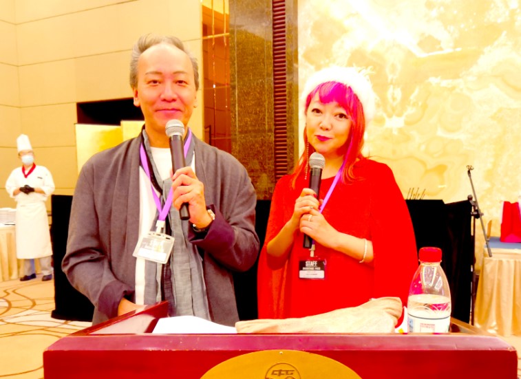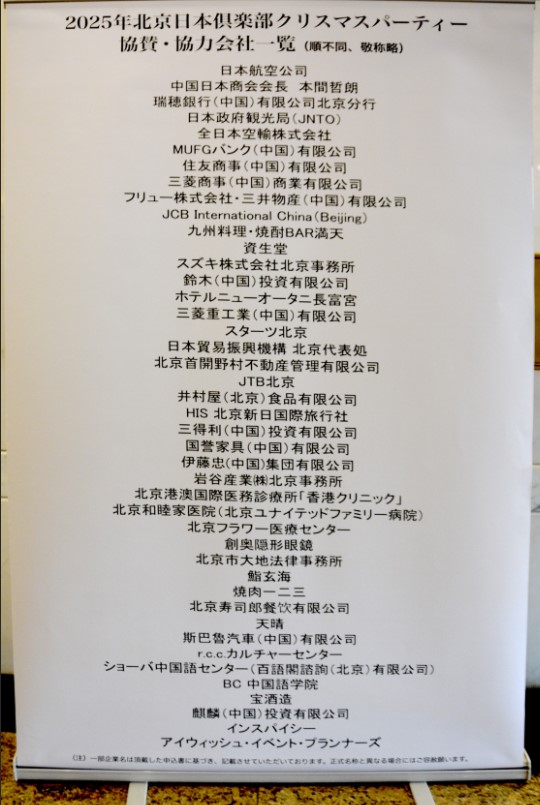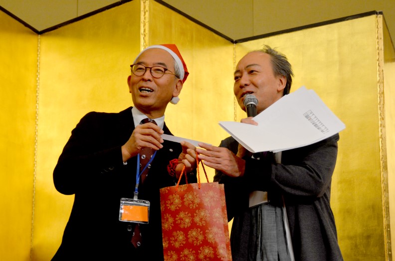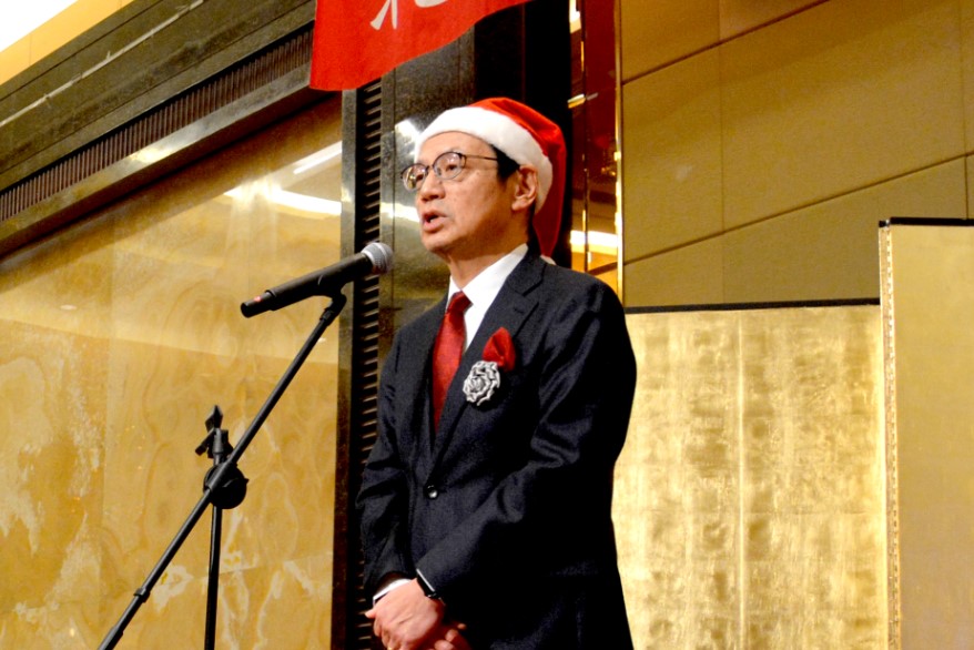 続いて、在中国日本国大使館金杉憲治大使がご登場。大使もサンタになってる!大使の乾杯のご発声でパーティーがスタートしました。