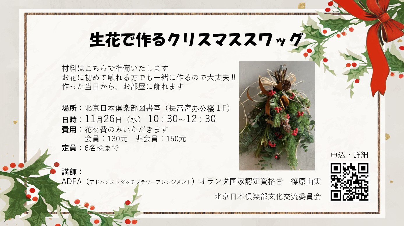 〇参加費(花材費のみ/作成個数毎):北京日本倶楽部会員 130元程度/個 非会員:150元程度/個