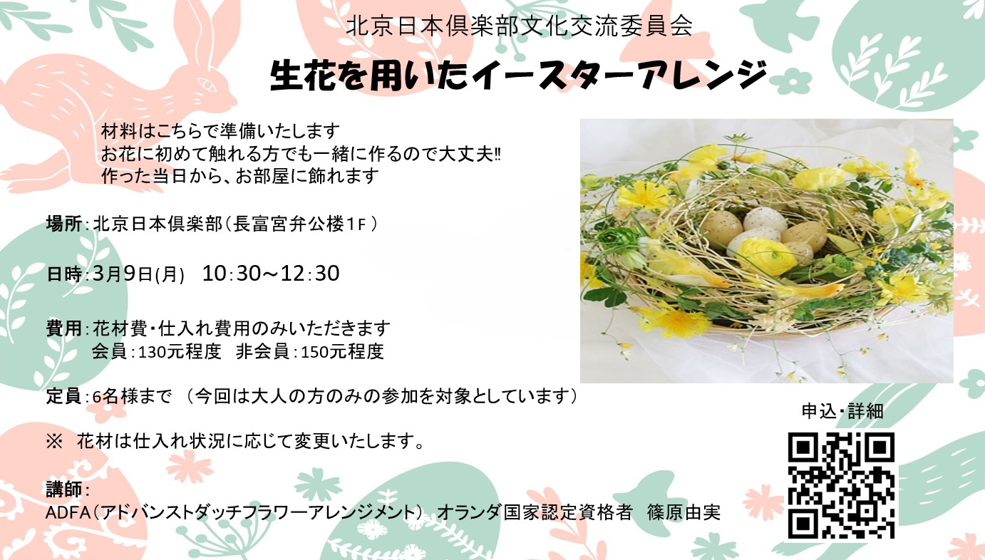 〇参加費(花材費のみ/作成個数毎):北京日本倶楽部会員 130元程度/個 非会員:150元程度/個