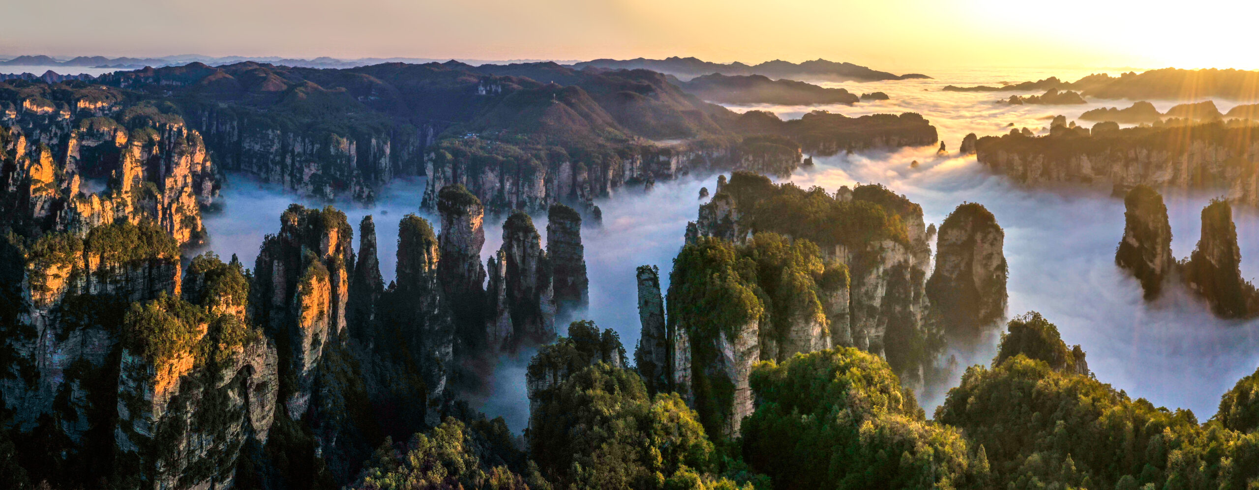 3,000本以上の岩柱が雲海から突き出し、漢の時代に隠れ住んだ張良の伝説や、映画『アバター』のインスピレーションの源となった、地球が数億年かけて創り上げた「生きる山水画」です。