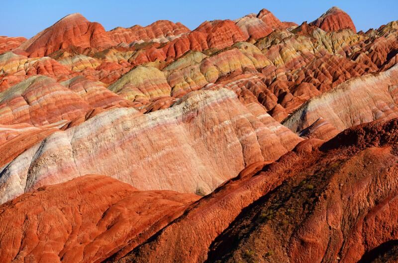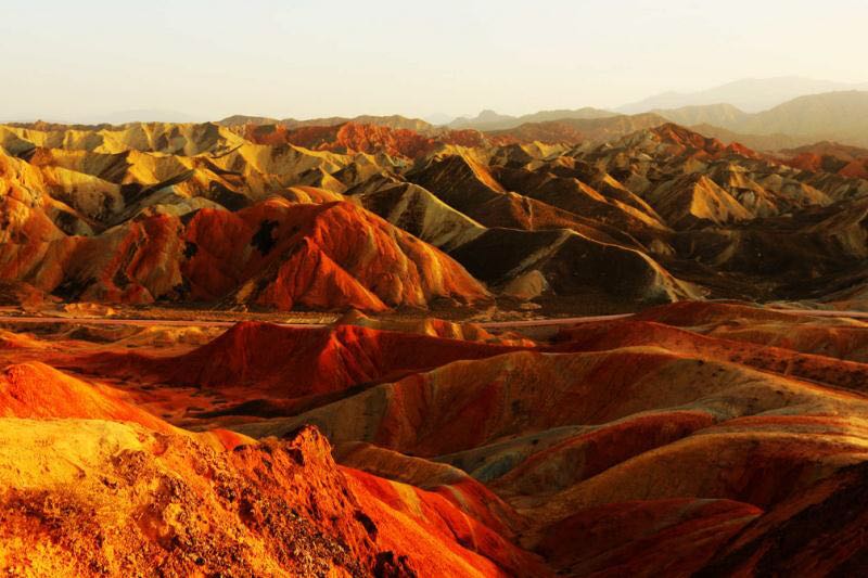 赤、橙、黄、緑、白……虹を溶かして大地に流し込んだような色彩が、どこまでも続く層々の岩肌。夕焼け雲を意味する「丹霞(たんか)」という名の通り、この地はまるで空の残照が地に降りて、固まり、風化し、そして永遠となったかのようです。