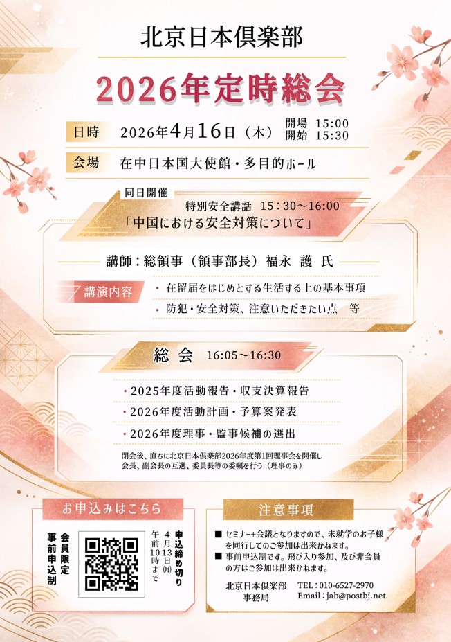 ※閉会後、直ちに北京日本倶楽部2026年度第1回理事会を開催(新年度理事のみ)