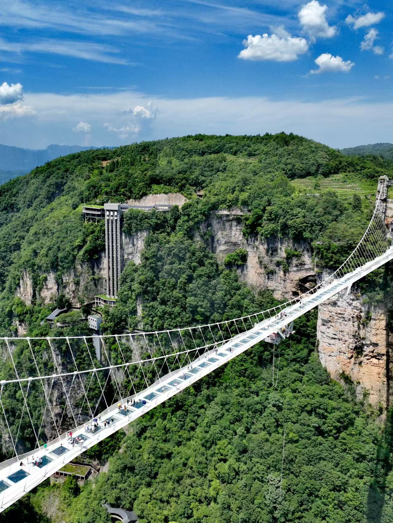 世界最長級のロープウェイにて頂上へ(現在ロープウェイ一部工事中で、頂上までロープウェイとシャトルバス、エスカレーター利用になります)。ガラス張りの桟道と、ぽっかり空いた天然の洞穴「天門洞」を観光。